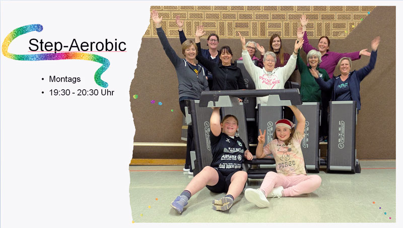 Step Aerobic: Ein Angebot für alle, seit mittlerweile über 25 Jahren. Derzeit gehören zu den Aktiven jeden Montag ca 7-10 Frauen und Mädchen. Gaby Vornkahl-Hoffmann spornt unermüdlich zu 30 Minuten kurzweiliger Choreografie auf dem Stepper an, unterstützt von rhythmischer Musik, um dann noch 30 Minuten allgemeine Gymnastik auf der Matte folgen zu lassen. Wir freuen uns über Verstärkung, jeden Montag von 19:30-20:30 Uhr in der Dingelber Sporthalle. |